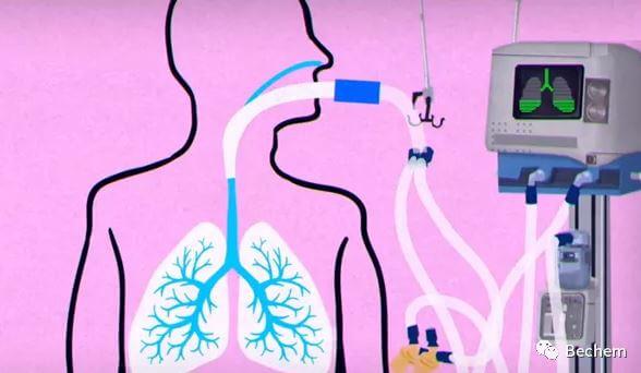 新冠病毒感染者肺部存在积水,病人需要额外的机械呼吸机来帮助摄入氧气。呼吸机的管道直接插入病人的气管,向肺部直接打入空气,一系列的支路和阀门形成了吸气和呼气的回路。