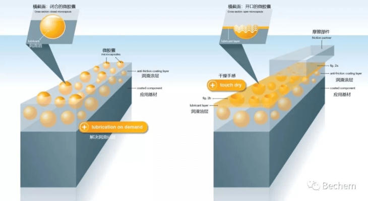 Bechem将微胶囊放入水基溶液体系中,研发出Berucoat MC产品。该产品应用在零件上的方法与传统润滑涂层相同,有浸泡,喷涂,或者刷涂。