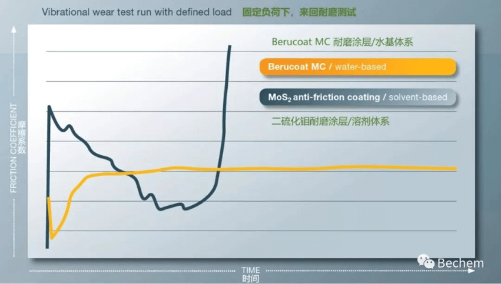 新型润滑涂层产品Berucoat MC能够极大地延长零件的使用寿命。通过显微镜检查来回摩擦之后零件表面的状态,Bechem发现含有微胶囊的涂层Berucoat MC与传统的二硫化钼润滑涂层相比,寿命延长了三倍